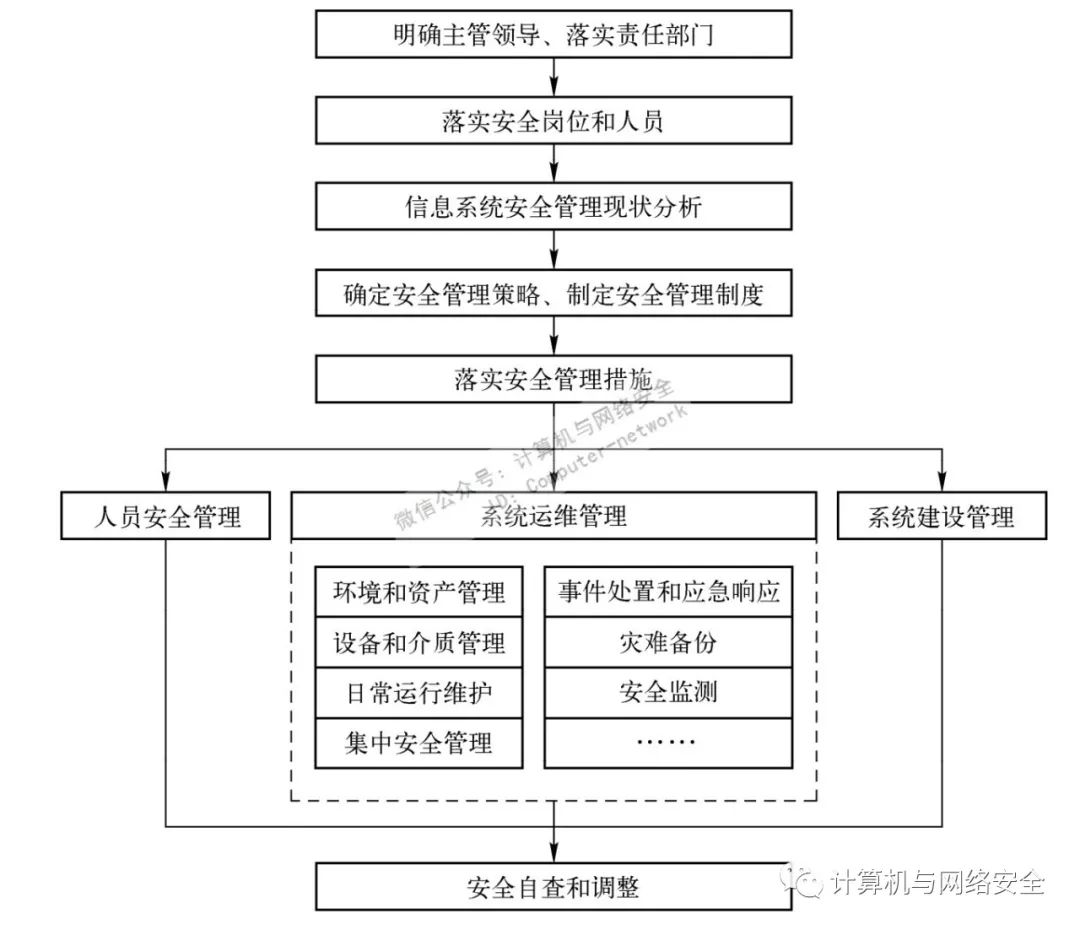 ② 三項(xiàng)重點(diǎn)工作。通過組織開展安全管理制度建設(shè)、技術(shù)措施建設(shè)和等級(jí)測(cè)評(píng)等三項(xiàng)重點(diǎn)工作,落實(shí)制度的各項(xiàng)要求。