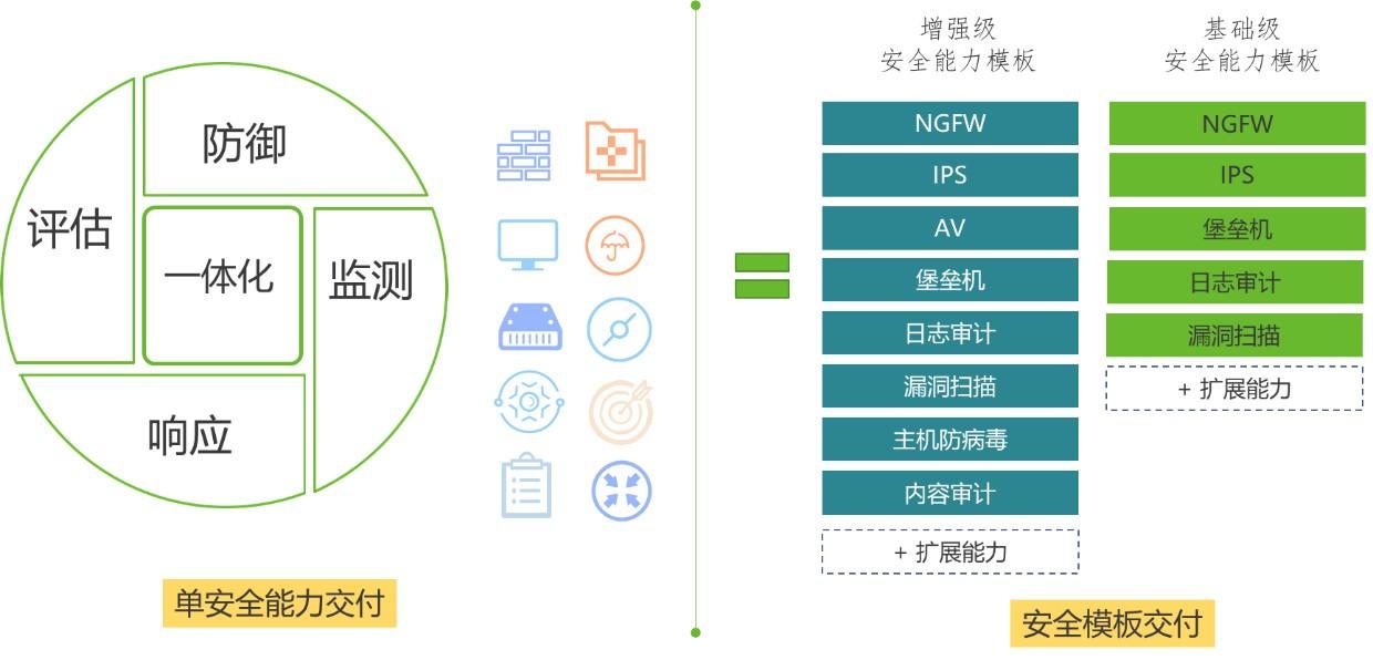 采用通用硬件平臺,綜合多種安全能力,以安全服務(wù)交付的形式,快速形成安全能力模板,一站式完成安全能力建模。